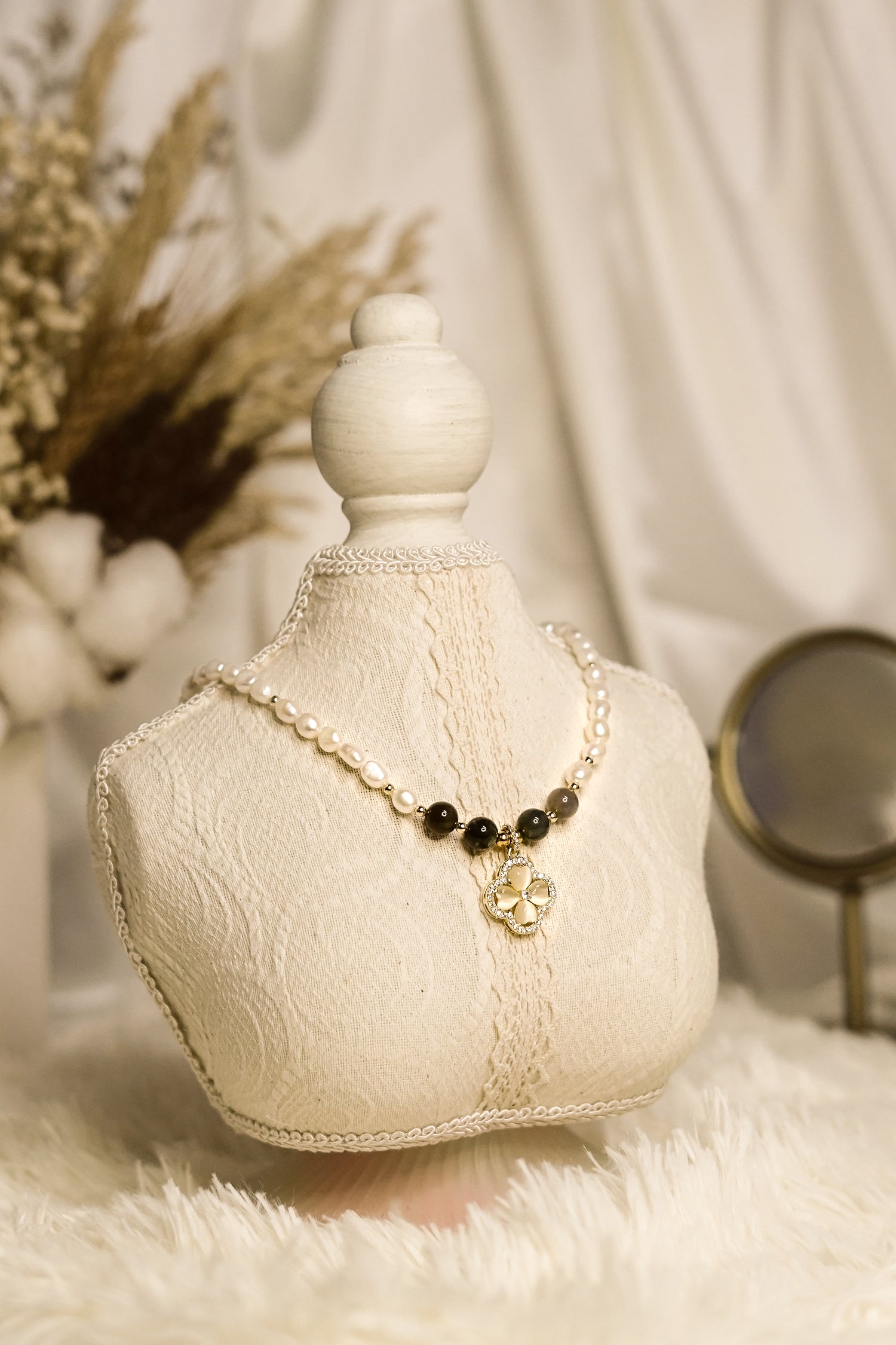 Style: All Pearl Necklace Agate Stone and Flower Pendant in a micron setting