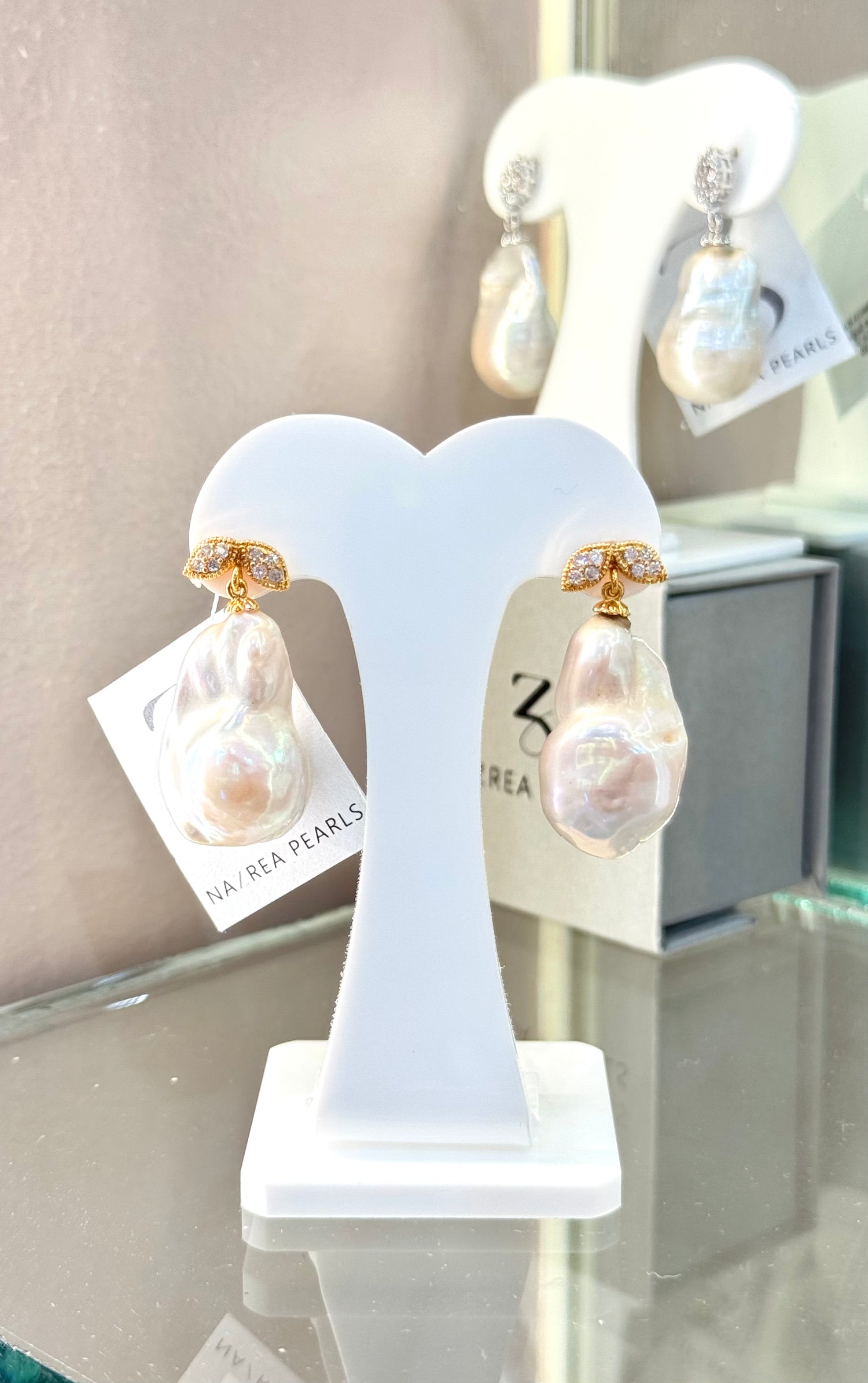 Real cultured freshwater baroque pearls dangling with russian stones in micron setting.