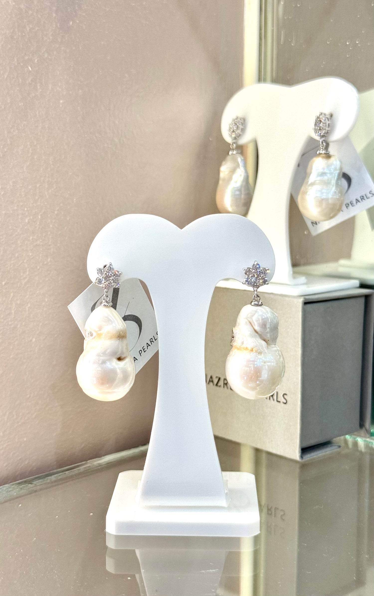 Real cultured freshwater baroque pearls dangling with russian stones in micron setting.