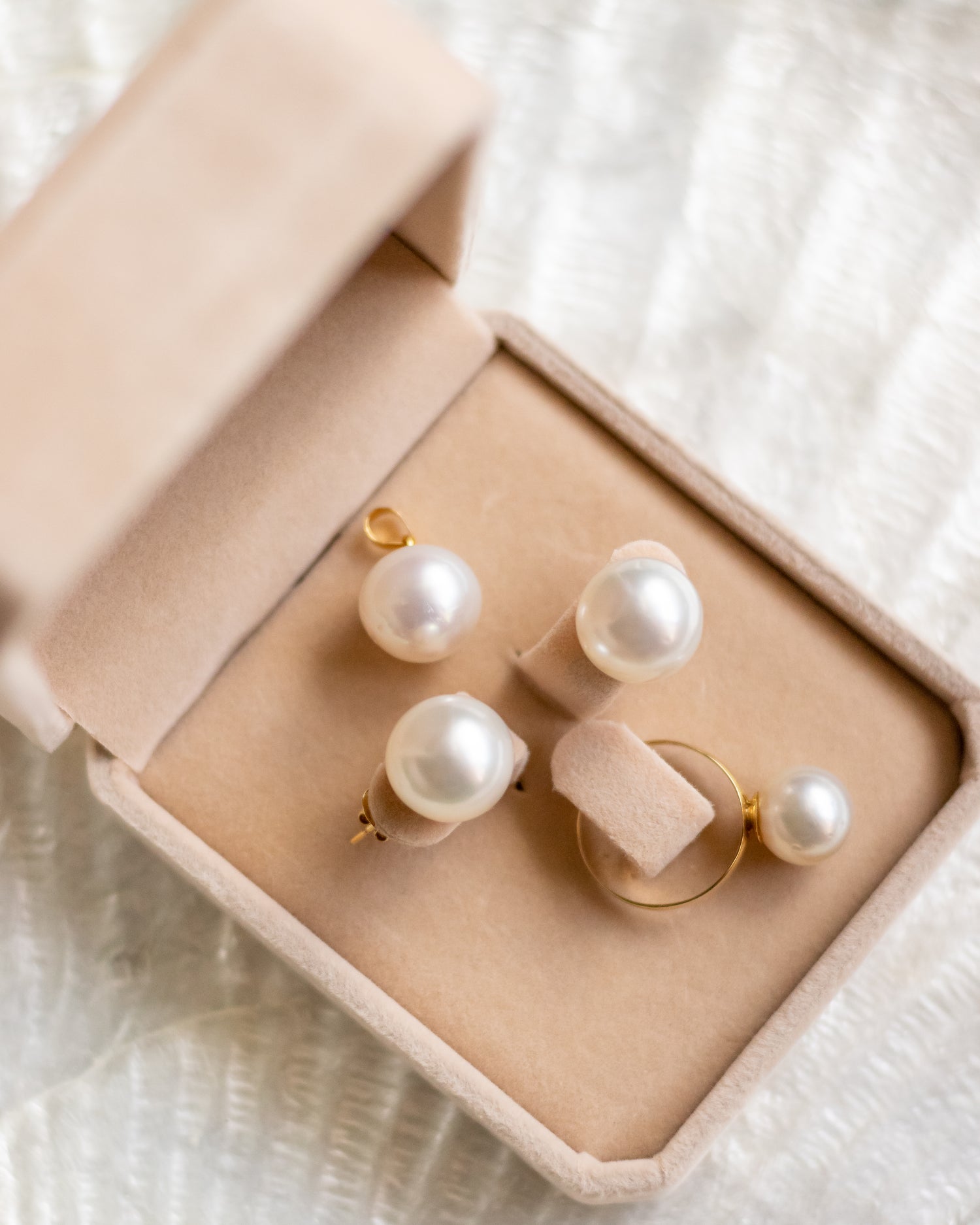 Materials: Genuine South Sea Pearls in 14-karat yellow gold. This set includes pendant, ring and earrings only.